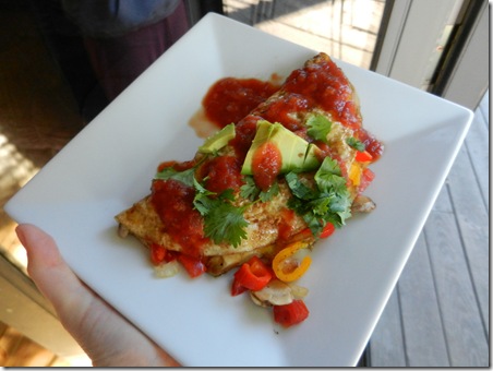 Breakfast: 1 egg and egg white omelette with sautéed bell peppers, onions, tomatoes, and mushrooms, topped with avocado, cilantro, and salsa.